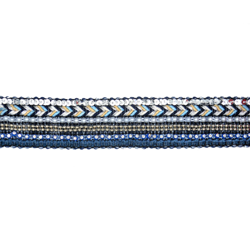 Η Τρέσα Πολυεστερική Μπλε 35 mm 115106 είναι μια πολύ όμορφη και ποιοτική τρέσα. Η συγκεκριμένη τρέσα μπορεί να διακοσμήσει εορταστικά και βραδινά όπως φορέματα, σακάκια, ζακέτες και άλλα. Πρόκειται για μια αμπιγέ τρέσα με πούλιες, πέρλες και στρασάκια σε μπλε αποχρώσεις. Επίσης με την συγκεκριμένη τρέσα μπορείτε να διακοσμήσετε τα σανδάλια σας κολλώντας την σε αυτά με κόλλα ή σιλικόνη. Το πάχος της είναι 3,5 εκατοστά και το υλικό κατασκευής της πολυεστέρας.
